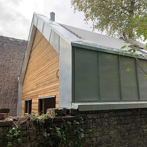 Toiture membrane PVC et zinc naturel pour cet atelier à Lille.