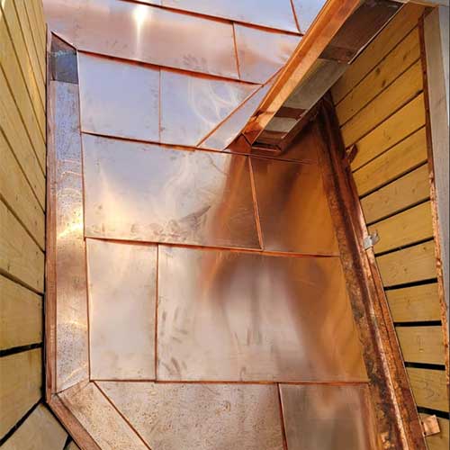 • La restaurantion de l’ornementation en cuivre qui souligne la ligne de bris de la toiture.
