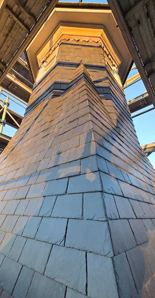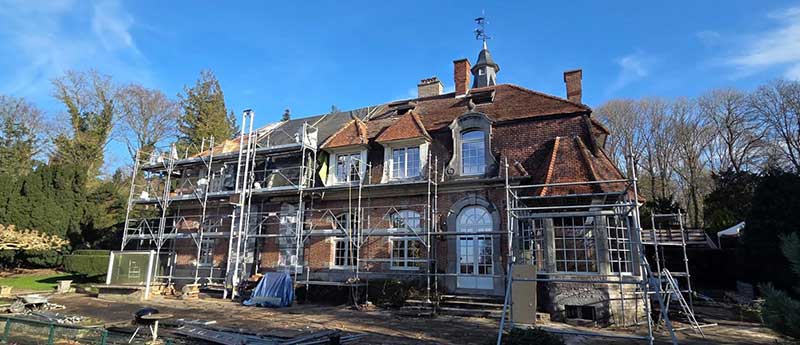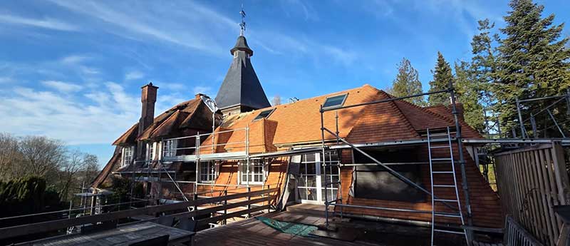 Rénovation complète de la toiture alliant des techniques de couverture traditionnelles et des matériaux nobles.
