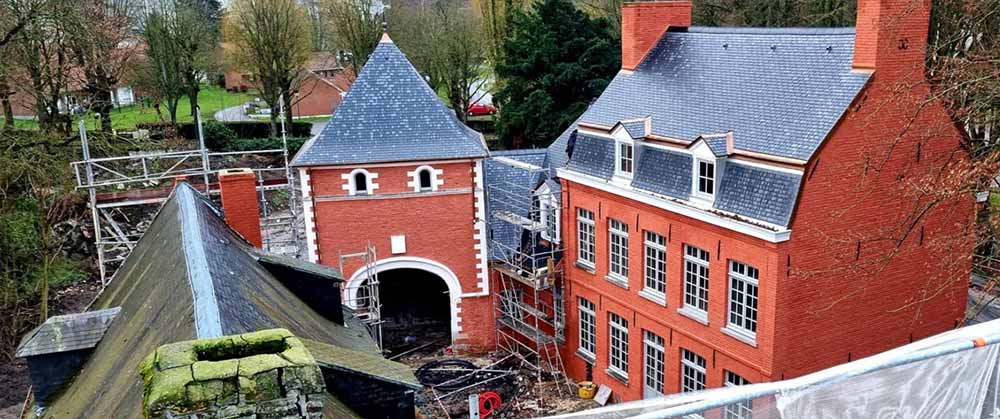 • La rénovation complète de la couverture en ardoises naturelles avec pose au crochet sur le corps de logis et le pavillon carré (tour de passage) ainsi que l’épi de faîtage décoratif de ce dernier.